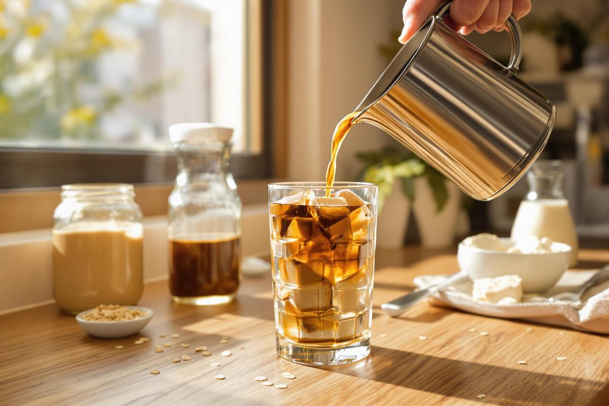 Lait entier, avoine, amande… chacun a son petit effet. Si tu veux une texture douce et légèrement sucrée, va pour le lait d’avoine. C’est aussi celui qui mousse le mieux si tu veux un effet cappuccino froid. Et pour un twist maison, tu peux le faire toi-même : mixe une tasse de flocons d’avoine avec un litre d’eau, filtre, c’est prêt !