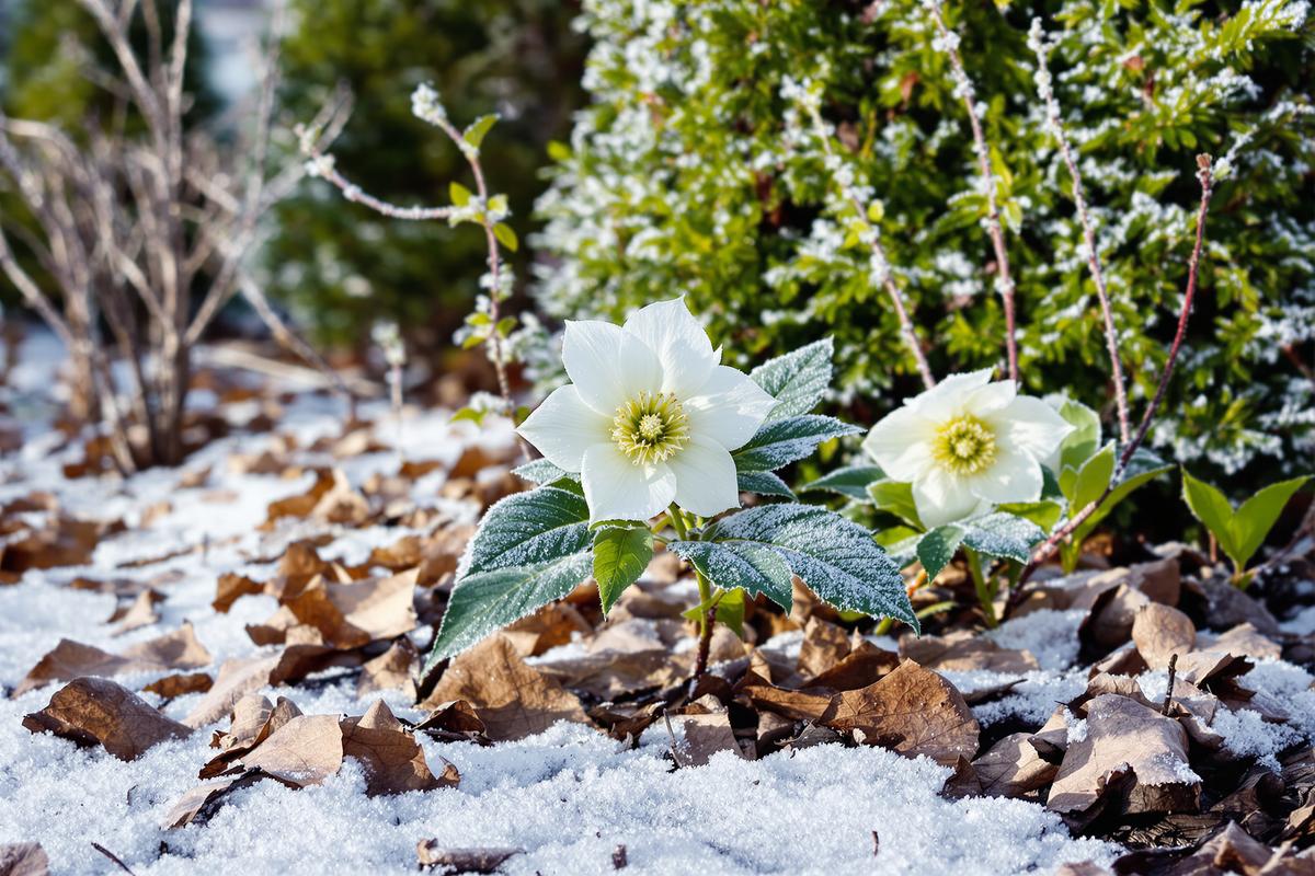 L’hellébore possède des atouts uniques. Ses feuilles épaisses et ses racines solides la protègent du gel. Une fois en terre, elle se défend seule face au froid, aux vents et même à la neige légère.