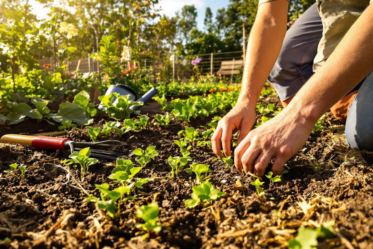 Sème en ligne ou à la volée, mais pense à espacer chaque future plante d’environ 15 cm. Recouvre légèrement, tasse un peu avec la main, puis arrose en pluie très fine. Un paillage léger (paille, tonte sèche) évite que l’eau ne s’évapore trop vite.